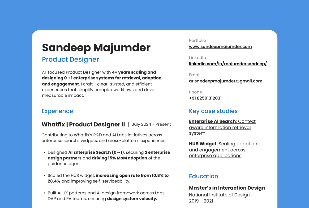 An Experience Designer at Whatfix, crafting solutions for complex, real-world challenges in enterprise and AI UX. Outside work, I’m most likely enjoying a cup of coffee at some cafe Here’s a collection of my recent work.