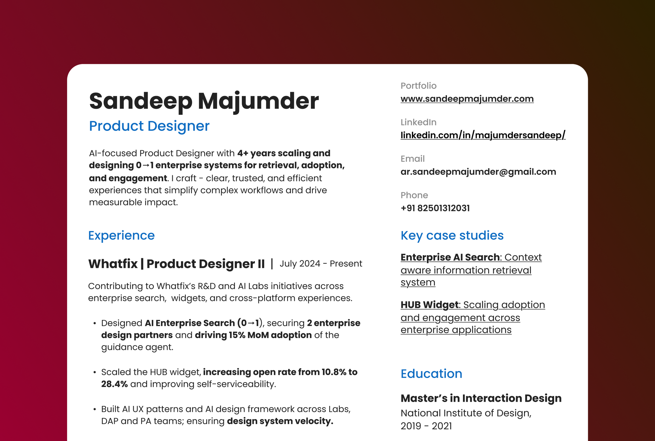 An Experience Designer at Whatfix, crafting solutions for complex, real-world challenges in enterprise and AI UX. I design for the evolving era of AI, that bridges user needs with business impact. Outside work, I’m most likely enjoying a cup of coffee at a cafe Here’s a collection of my recent work.