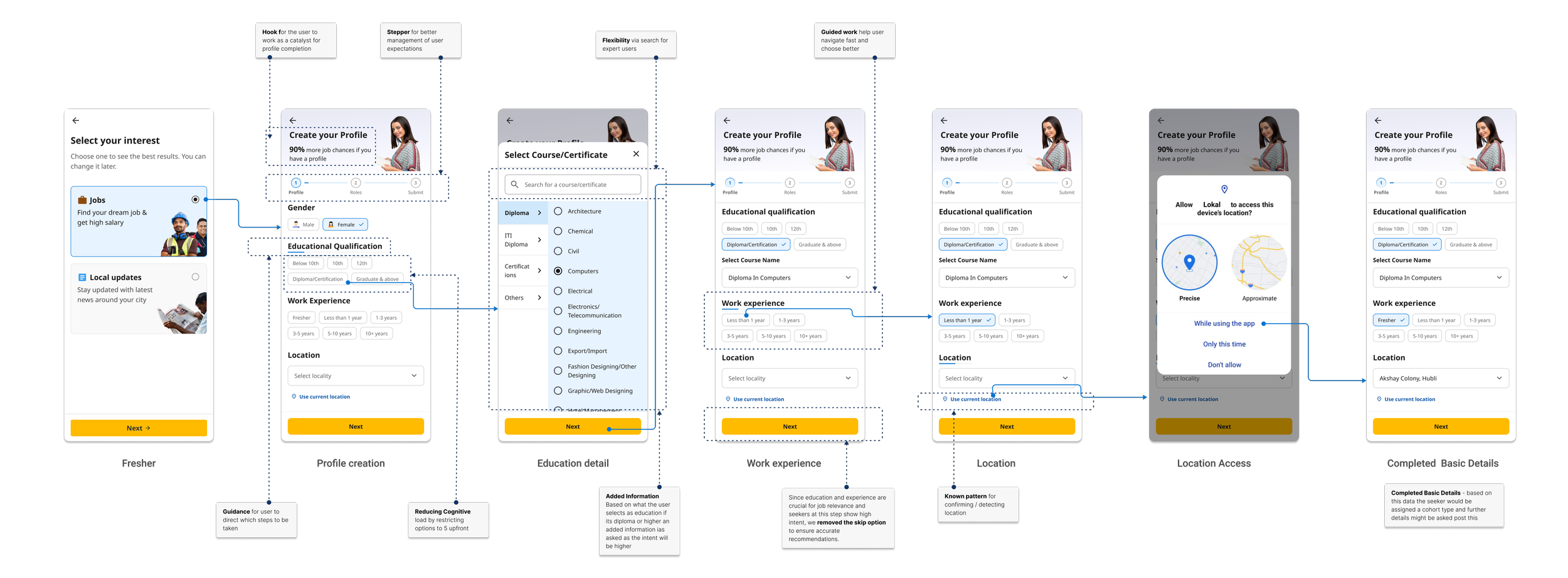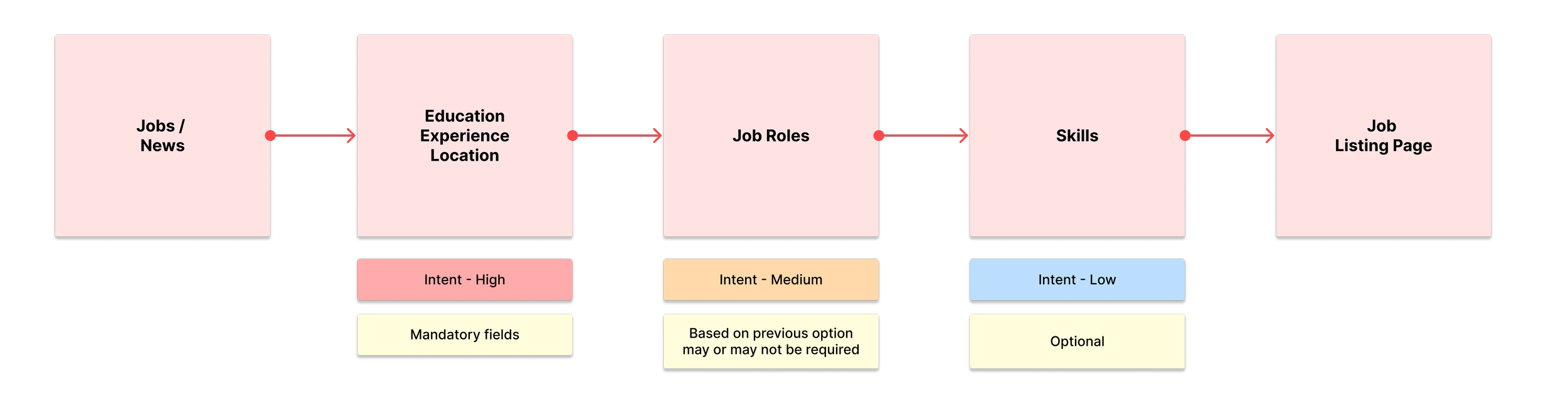 User intent is highest the moment they enter the Jobs section and drops afterward. To maximize relevance, essential information is collected immediately, while deeper details are requested later only when needed for their cohort.