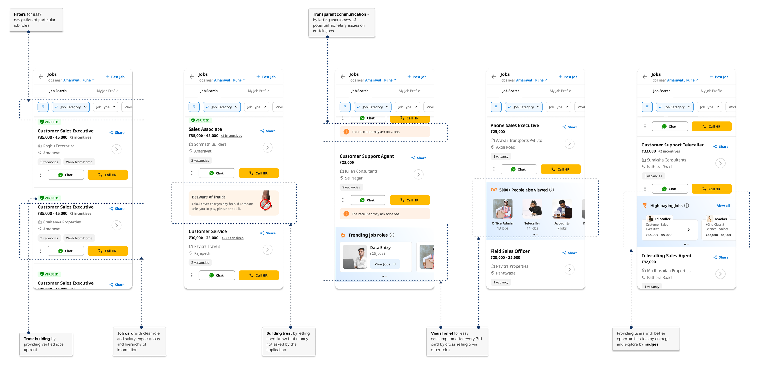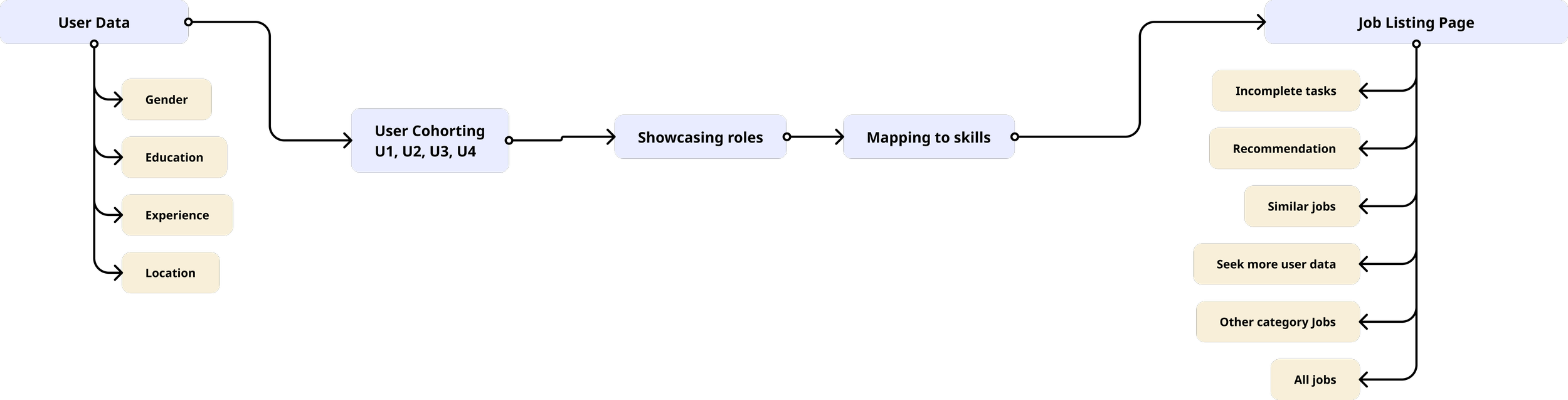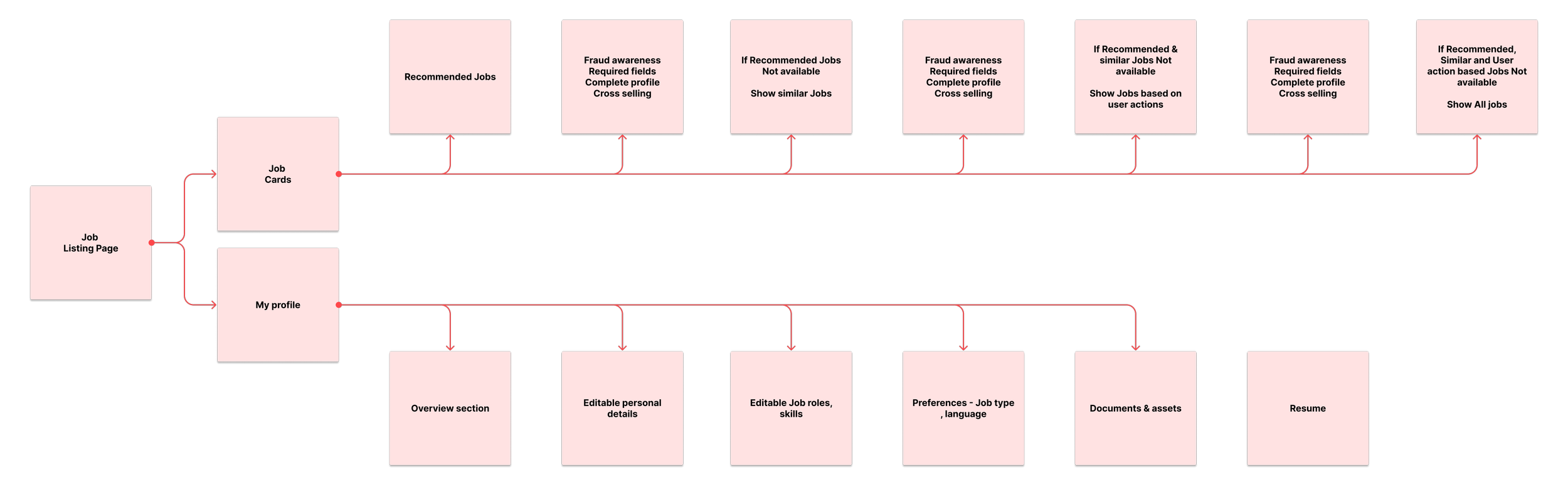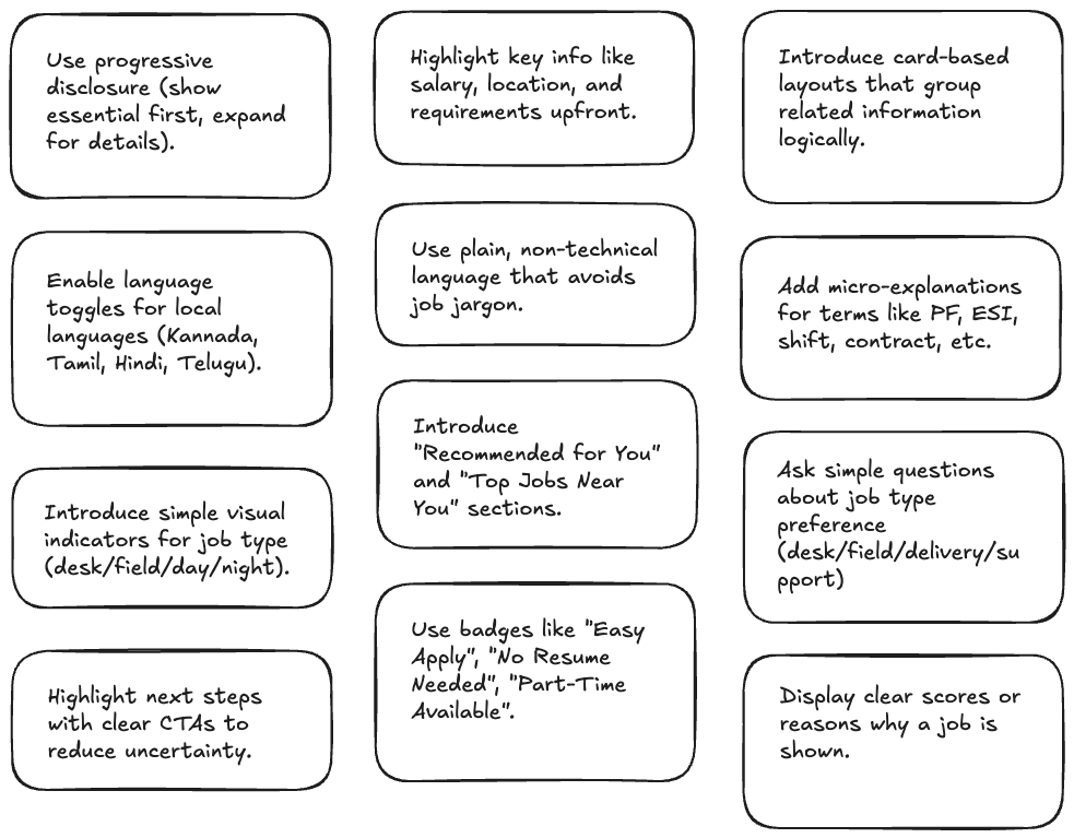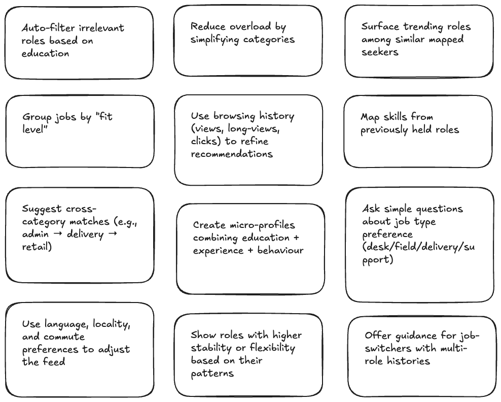 Through opportunity mapping, I converted user frustrations and behavioural patterns into clear, actionable focus areas. This helped me identify the strongest levers for improving the platform thereby enhancing job relevancy to reducing cognitive load and enabling frictionless, guided interactions.