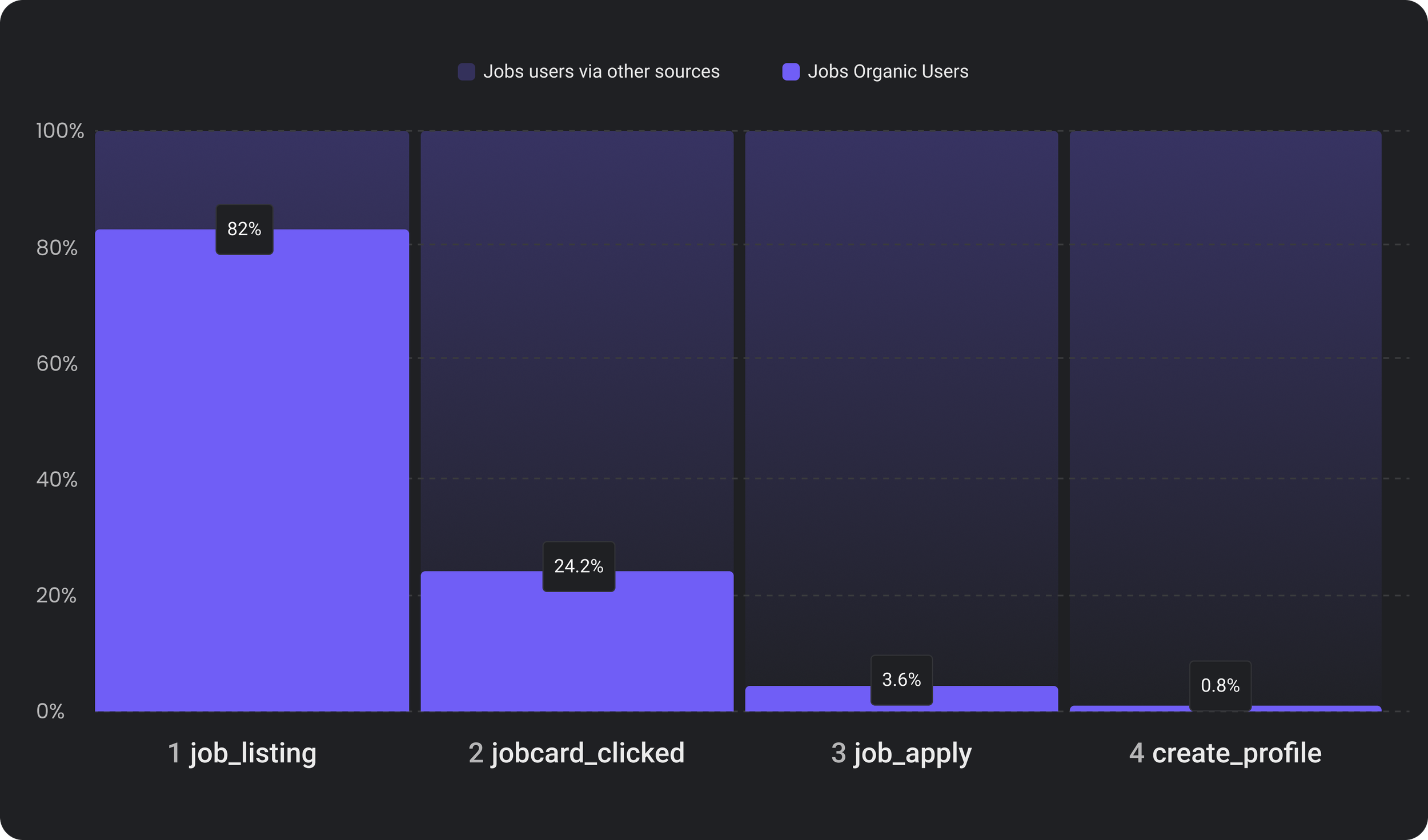 Among the organic users who did reach the JLP, fewer than 30% clicked a job card, only 15% of those initiated an application, and just 5% fully completed their profile and uploaded a resume.