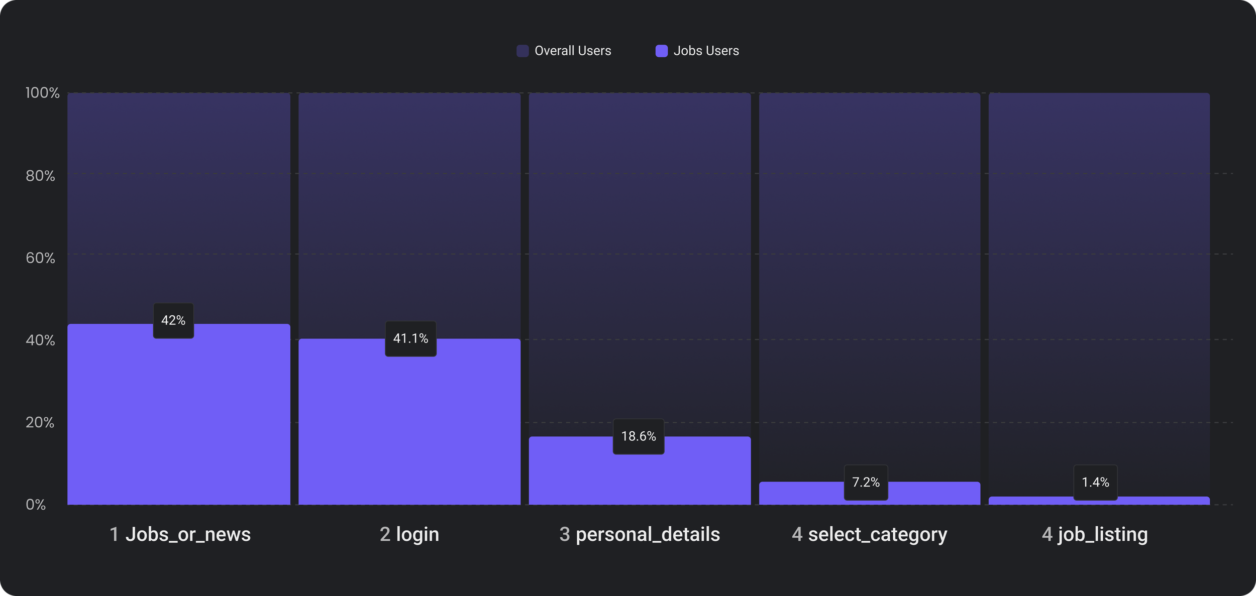 Deeper analysis showed major drop-offs across both profile creation and the job-listing journey. More than half the users who logged in abandoned the process while entering personal details and selecting a job category, leaving only a small fraction reaching the Job Listing Page.