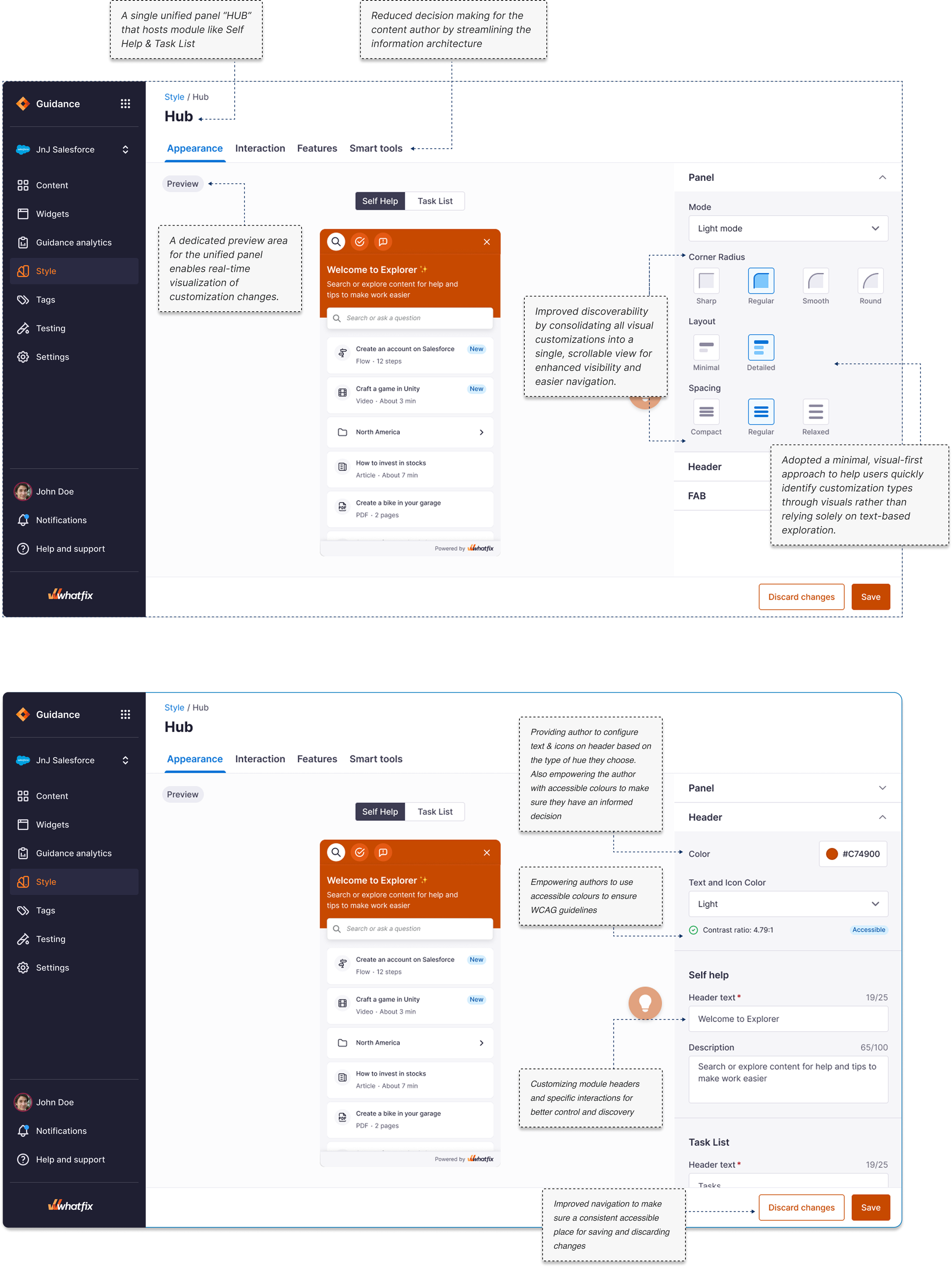 To reduce friction, the system offered configurations that allowed authors to play around and understand the tool better. These included structured defaults, layout mappings, and visual styling controls designed to match the base application seamlessly maintaining accessibility guidelines. Built-in preview capabilities ensured authors could see changes in real time before publishing.