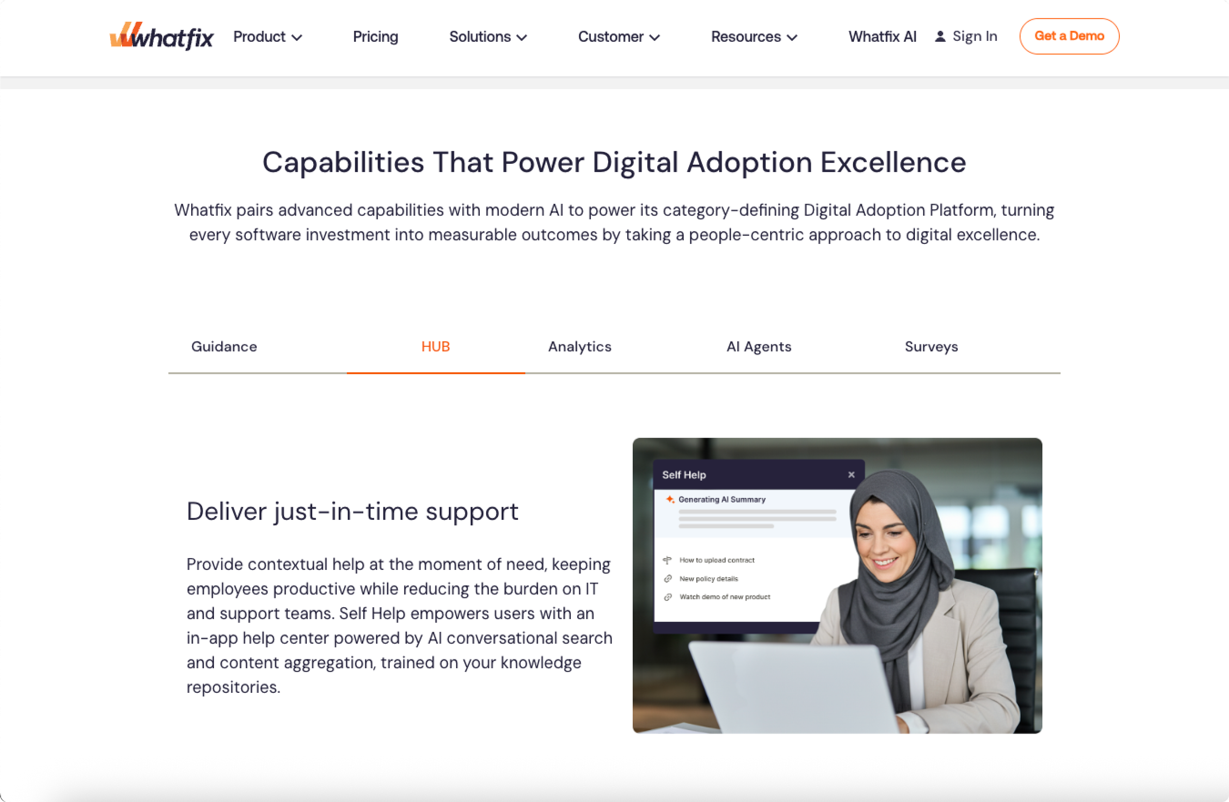 Driving adoption and engagement in enterprise applications through Whatfix HUB widget thereby enabling teams to deliver organizational knowledge, streamline workflows, simplify onboarding, and accelerate support resolution